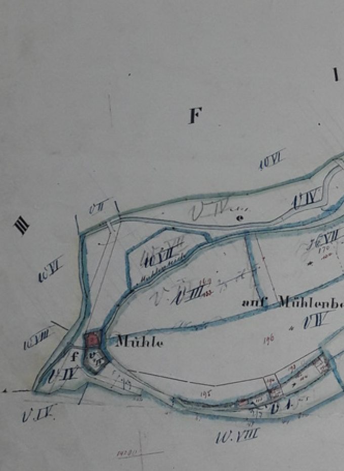 Das Flurstück "auf Mühlenberg" war im Jahre 1827 Heideland und im Besitz des Bleialfer Ortsvorstehers Peter BACH. Der gebürtige Halenfelder hatte ins BRAUS-Haus in Bleialf eingeheiratet. Mit seiner Ehefrau Katharina BRAUS war er 53 Jahre verheiratet. Sie hatten 9 Kinder. Hoferbe war der zweitälteste Sohn Michael BACH, der seit 1811 mit Anna Maria KNAUF aus Radscheid verheiratet war. Michael BACH verstarb bereits 1822, 34jährig. 6 Jahre später (1828) ehelichte die Witwe BACH den aus Obermehlen stammenden Ackerer Peter HAAS. Neben den drei Kindern aus erster Ehe, bekamen die Eheleute HAAS-Knauf, drei weitere Kinder, darunter den Hoferben Johann HAAS.