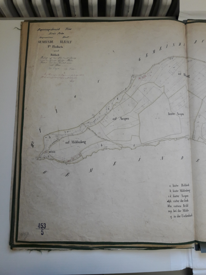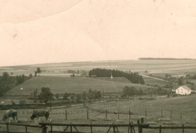 Am rechten Bildrand die Bleialfer Mühle; links davon das unbewaldete Flurstück169, heutige Waldfläche Flur 9/21 "Auf Mühlenberg", welches vor zirka 80 Jahren von der Familie meines Großvaters mit einer Fichtenkultur angepflanzt wurde. Hinter dem Mühlenberg befindet sich der Ortsteil "Hamburg". Heute befindet sich gegenüber der Mühle, das Besucherbergwerk Mühlenbergerstollen und im Tal an der Alf, das Wigwamhüttendorf der Ortsgemeinde Bleialf.