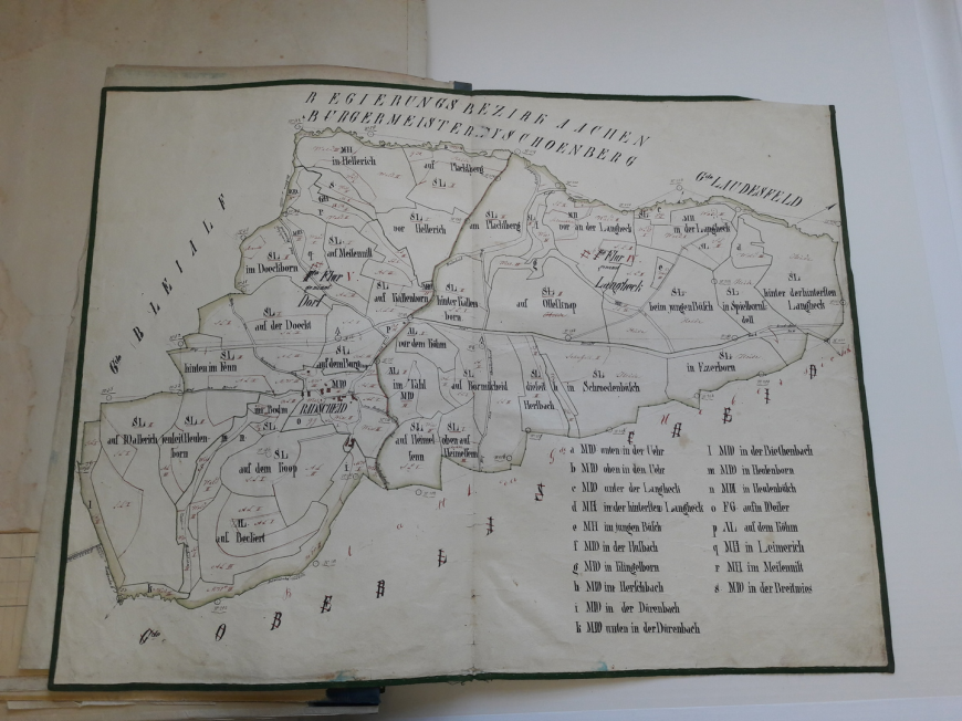 Flurkarte V. genannt Dorf, Gemeinde Oberlascheid (vormals Radscheid) Bürgermeisterei Bleialf, Kreis Prüm, Regierungsbezirk Trier;