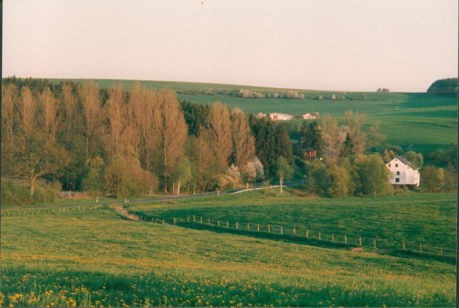 1995 Blick ins Alftal - Rechts die Bleialfer Mühle - gegenüber der Besucherstollen - hinter den Laubbäumen die Alf mit den Wigwamhütten. Dahinter noch ein gesunder Fichtenwald, ohne Käfer. Die Blumenwiese im Vordergrund ist heute mit Häusern bebaut.