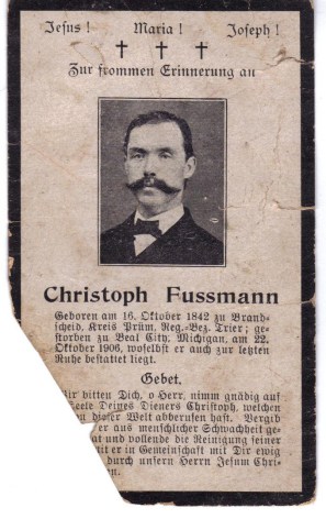 Der Totenzettel zeigt Christoph FUSSMANN, der am 16.10.1842 in Brandscheid als 4. von 10 Kindern der Eheleute Gregor FUSSMANN und Magdalena DERHOF geboren wurde. Christoph heiratete im Jahre 1872 in Habscheid, Elisabeth HOCKERTZ aus Hollnich. Dem Ehepaar wurden zwischen 1874 und 1882 4 Söhne geboren, von denen drei (Georg, Henry & John) mit den Eltern nach Beal City, Michigan, USA auswanderten. Christoph FUSSMANN starb am 22.10.1906 in Beal City.