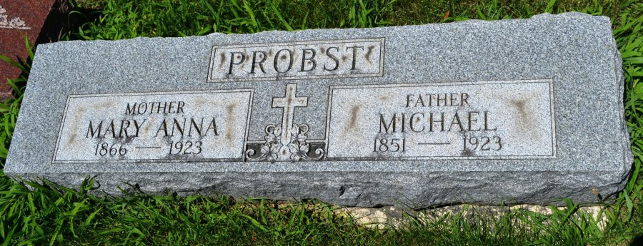 Michael PROBST wurde als 5. von 7 Kindern der Eheleute Johann PROBST und Katharina THEIS, am 17.03.1851 in Wallmerath geboren. 1852 zog die Familie von Wallmerath nach Bleialf (Jüstenschlag). Seine Eltern verstarben 1861 und 1867 in Bleialf. Seine älteste Schwester, 1903, ledig in Bleialf. Sein Bruder Hubert PROBST, starb 1895 in Algringen/Lothringen, wo er mit Frau und Kindern lebte. Michael wanderte zusammen mit seiner zwei Jahre jüngeren Schwester Anna um 1884 nach Nordamerika aus. Michael heiratete Mary Anna MART, Anna heiratete einen Julius MOLL der aus Österreich stammte. Michael verstarb am 16.11.1923 in Chicago.