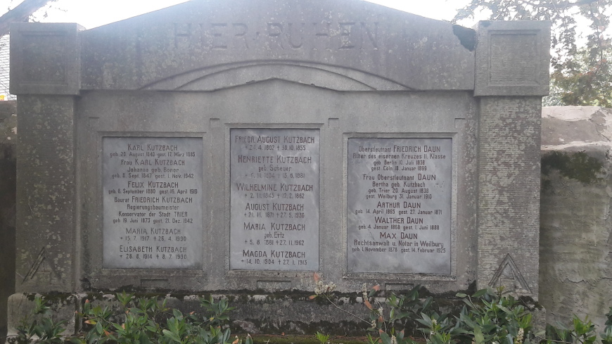 Friedrich August KUTZBACH, *24.04.1802 +30.10.1855 lt. seiner Heiratsurkunde von 1837 wurde er in Danzig als Sohn von Johann K. und Luise SCHUMACHER geboren. Seine Ehefrau Clara Henriette Sophie SCHEUER wurde am 06.11.1804 in Sobernheim als Tochter der Eheleute Johann Anton SCHEUER, königlicher Notar und Sophia KOHL geboren. Sie verstarb am 15.06.1881 in Trier