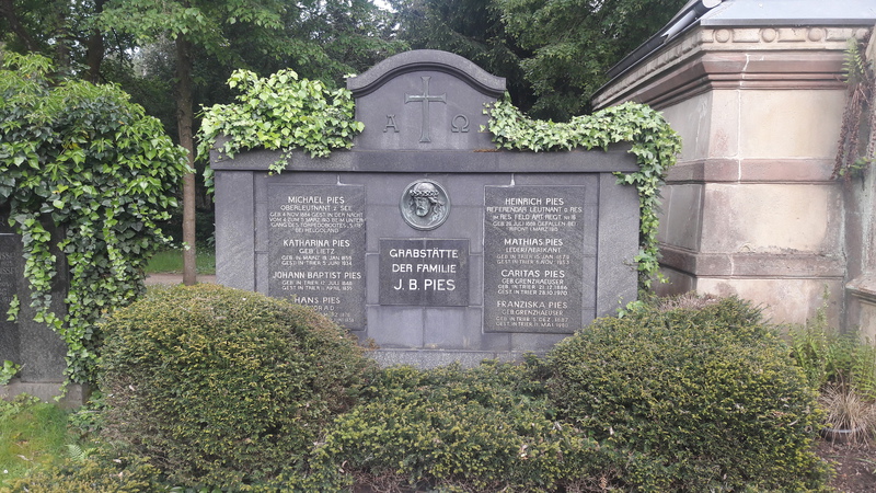 die älteste Person ist Sebastian DANY 1786-1857. Laut Sterbeurkunde ist er am 15.12.1857, 70jährig als Witwer von Josephine DUPONT, in Trier gestorben. Er war geboren in Trier, Rentner und Oberbürgermeisterbeigeordneter, Sohn von Balthasar DANY, Bierbrauer und Gertrud KIRCH, beide zuletzt wohnhaft in Trier. Die Sterbeurkunde bezeugt sein "Eidam" Johann Jacob HANSEL.
