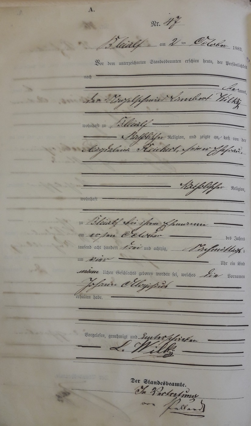 Die obige Geburtsurkunde aus dem Jahr 1883 zeigt die Geburt des Johann Aloysius WILKY, Sohn des Nagelschmied Lambert WILKY und seiner Ehefrau Magdalena geb. REICHERT, Eheleute aus Bleialf.