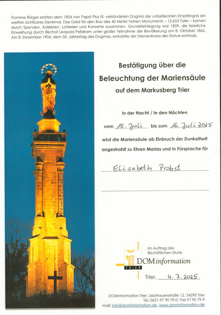Aus Anlaß des 50. Todestags am 15. Juli 1975 leuchtet die Mariensäule für Oma Lisbeth