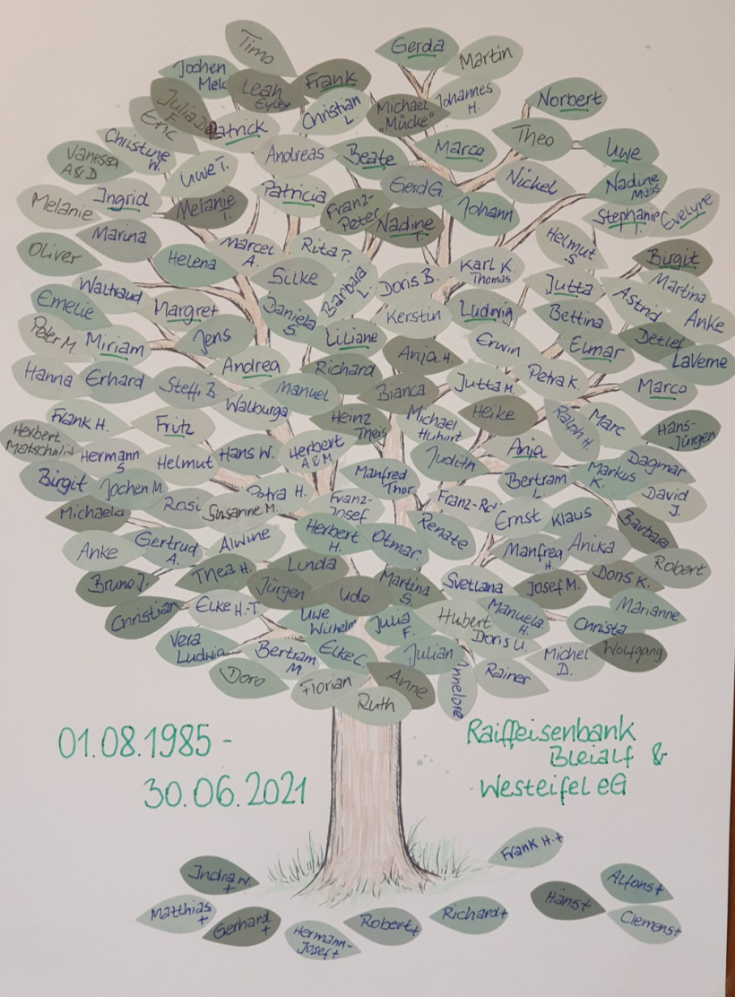 Jeder, der einmal mit mir gearbeitet hat, findet seinen Namen als Blatt an diesem Baum. Zu fast jedem Blatt an diesem Baum gibt es eine Story. Manchmal nur wenig Berührungspunkte, bei anderen mehr. Es gab nicht nur eine Freud-und Leidkasse in die man monatlich etwas eingezahlt hat, sondern freudige Lebensereignisse, als auch traurige Momente. Die Blätter am Boden, sind ehemalige Kollegen die in der Dienstzeit bzw. im Rentenalter den Raiffeisenbaum verließen. Ich wünsche allen alles Gute